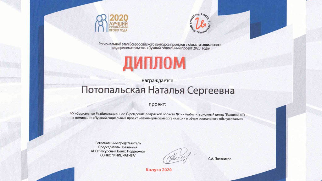 По результатам регионального этапа Всероссийского конкурса проектов в области социального предпринимательства «Лучший социальный проект 2020 года» ЧУ «Реабилитационное социальное учреждение Калужской области № 1» признано лучшим социальным проектом Некоммерческой организации в сфере социального обслуживания!