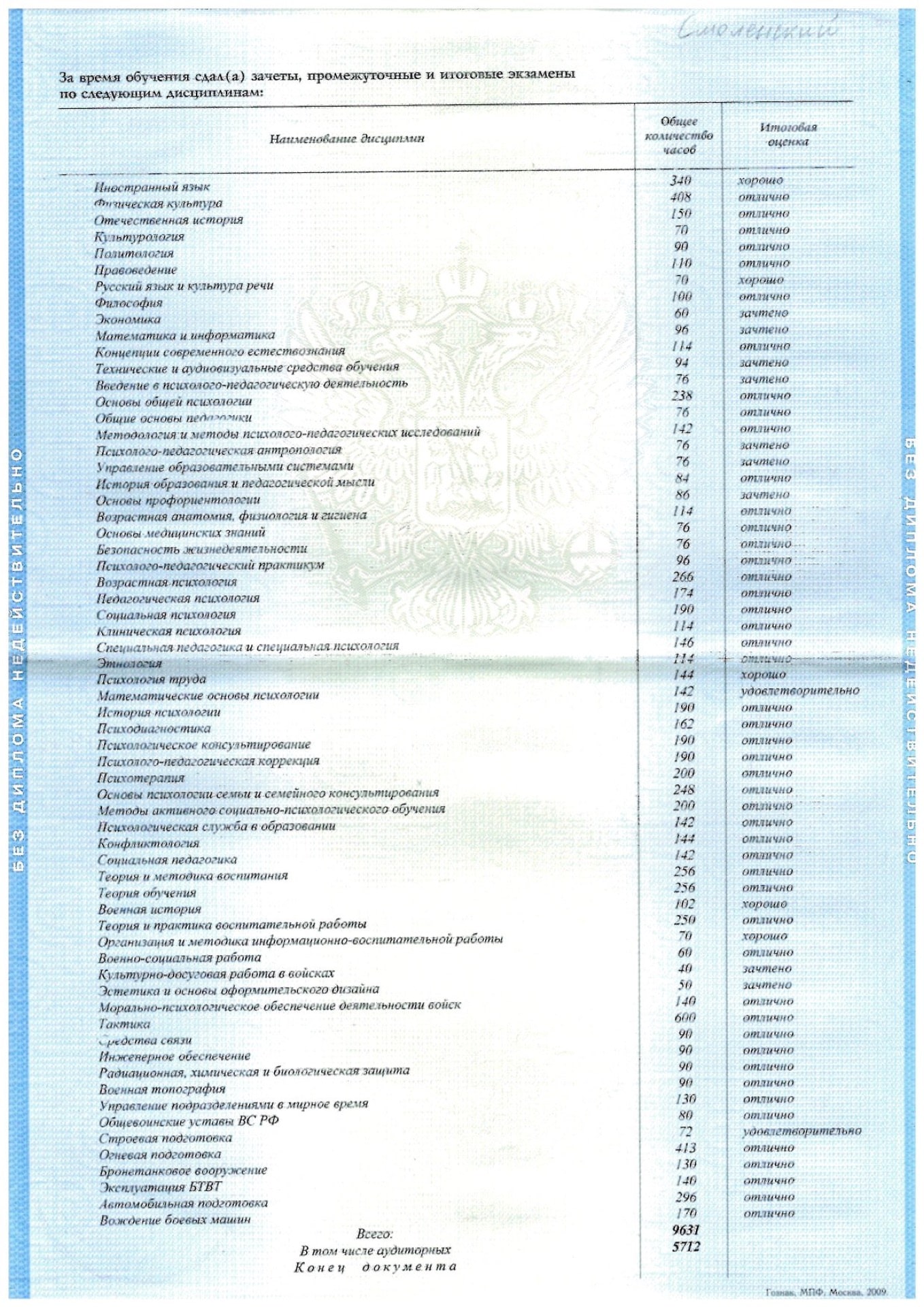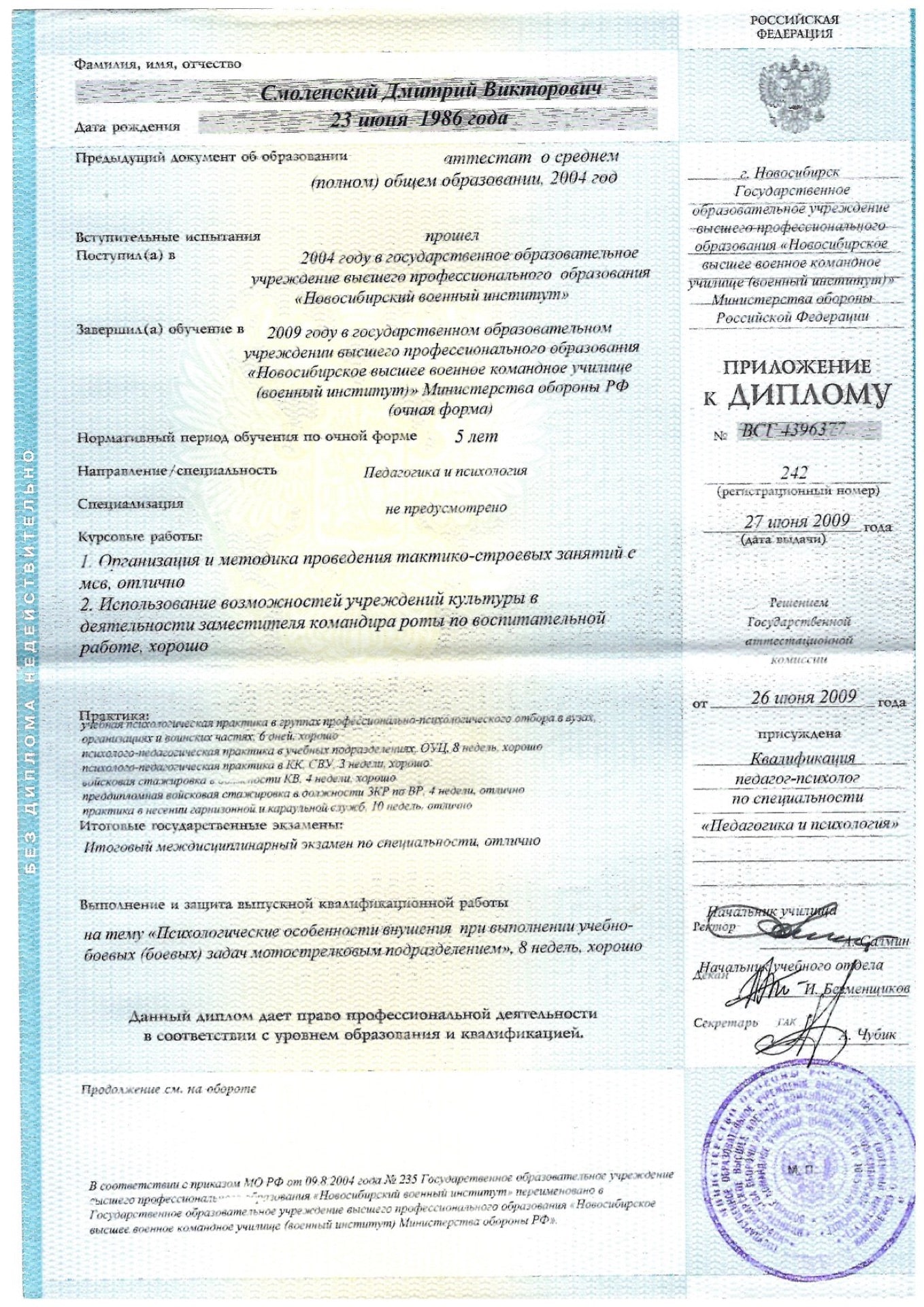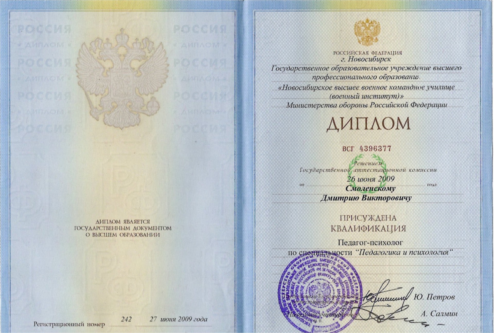 - Новосибирское высшее военное командное училище (военный институт) МО РФ. Квалификация «Педагог-психолог» по специальности «Педагогика и психология». 2004–2009 гг.