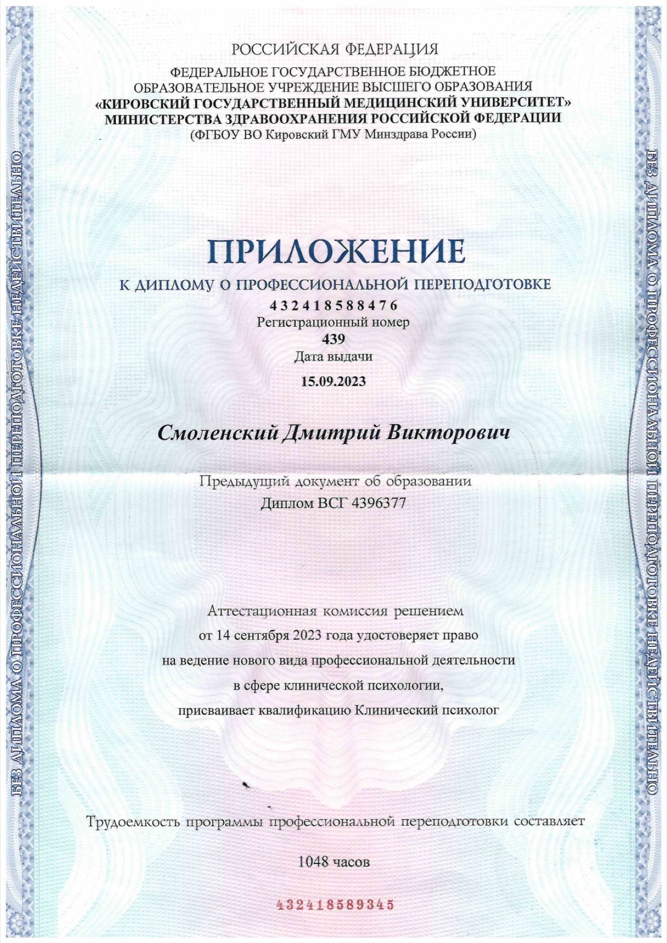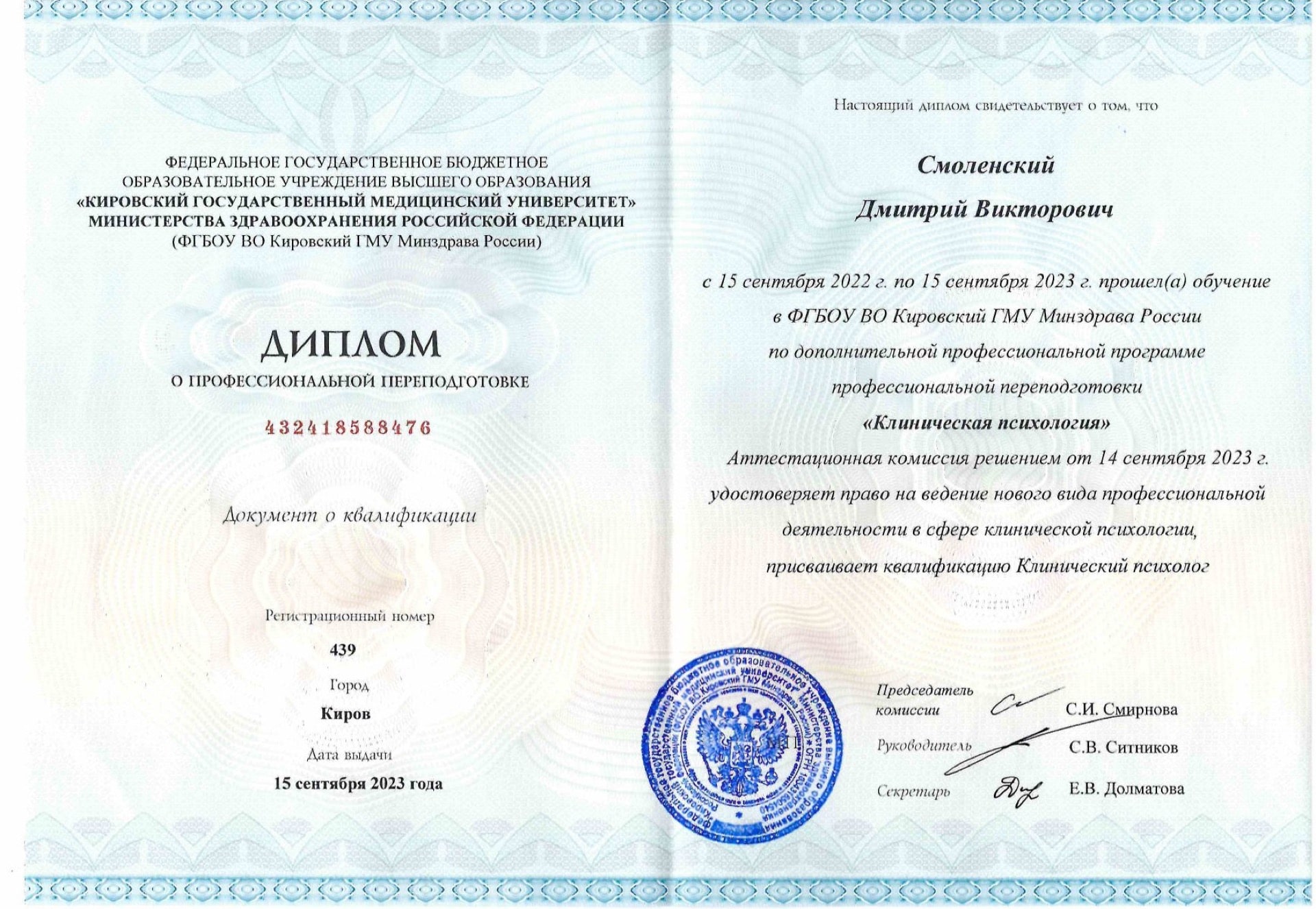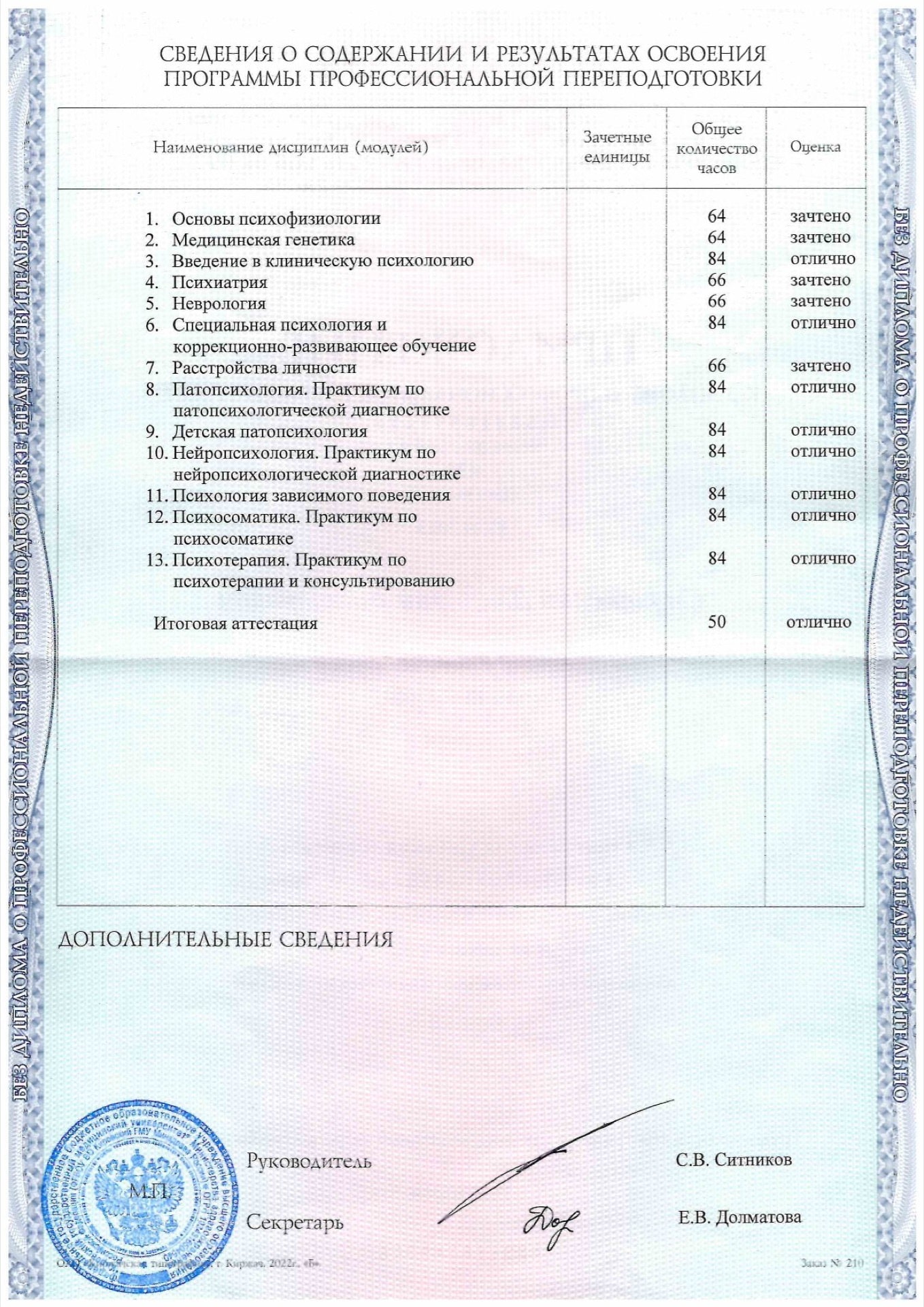 - Кировский государственный медицинский университет Минздрава РФ. Профессиональная переподготовка на ведение профессиональной деятельности в сфере клинической психологии, квалификация «Клинический психолог». 2022–2023 гг.
