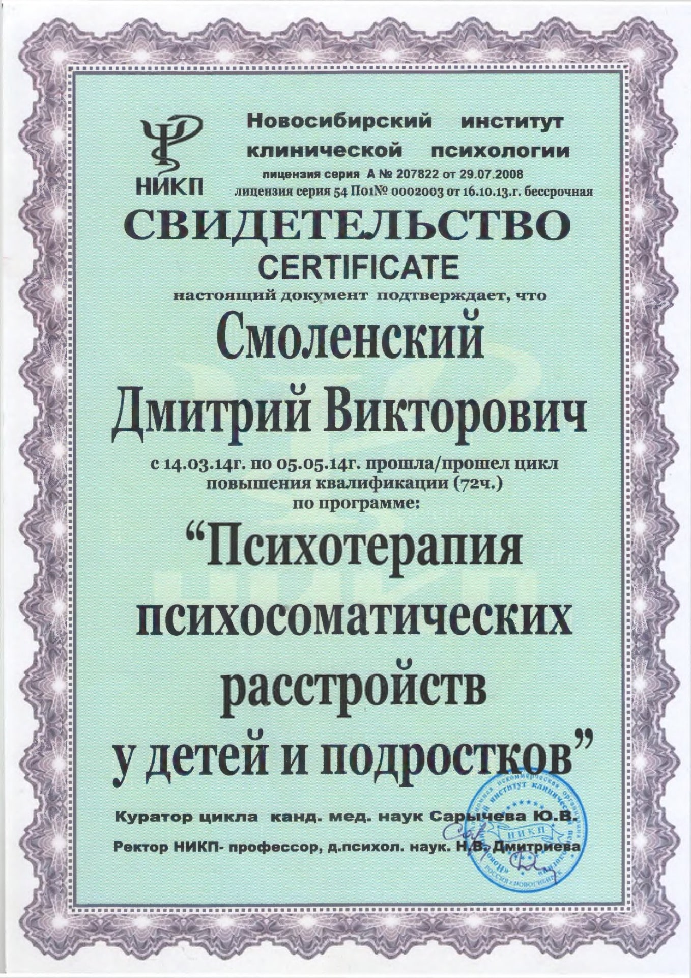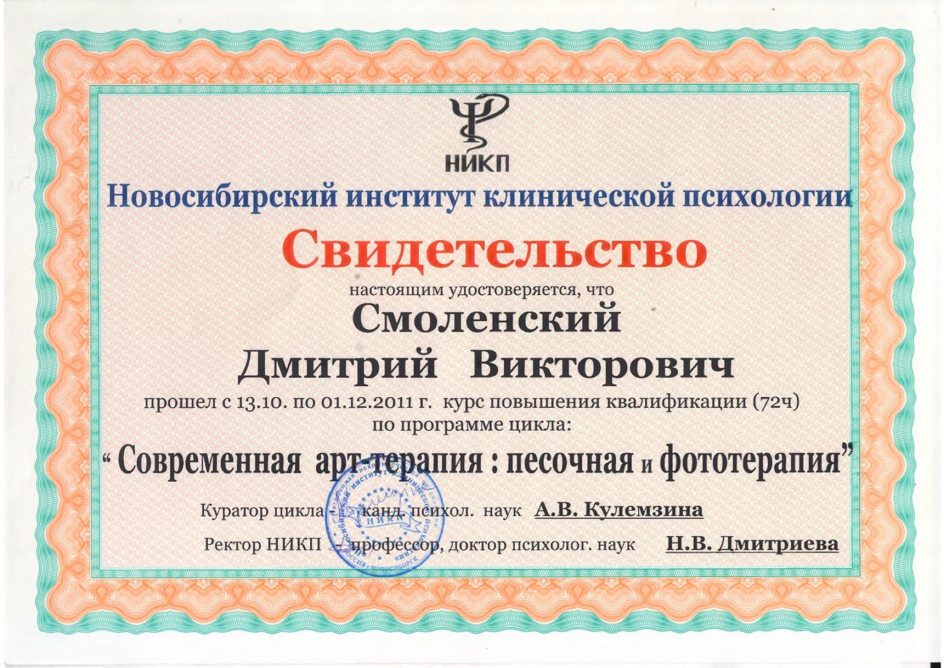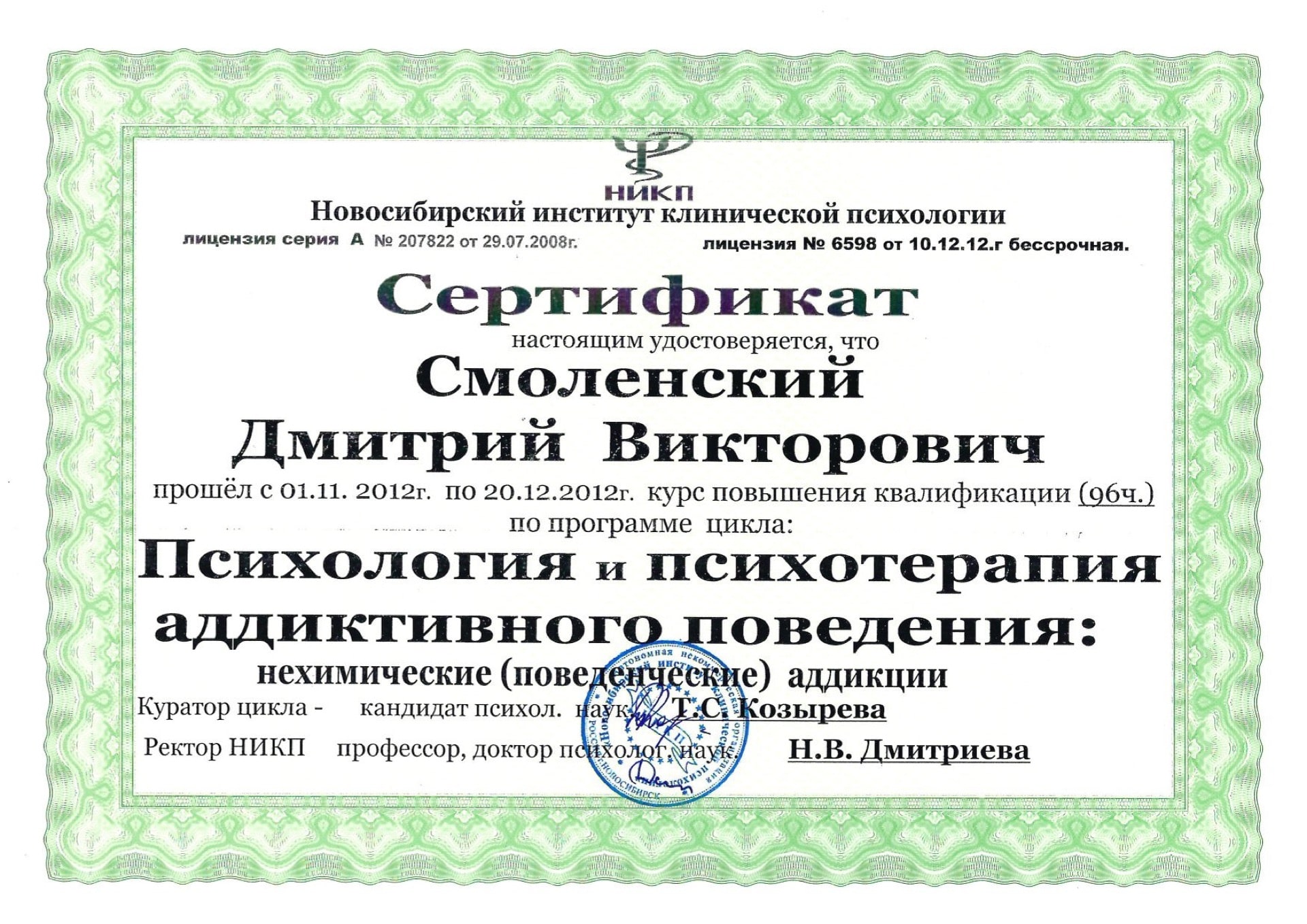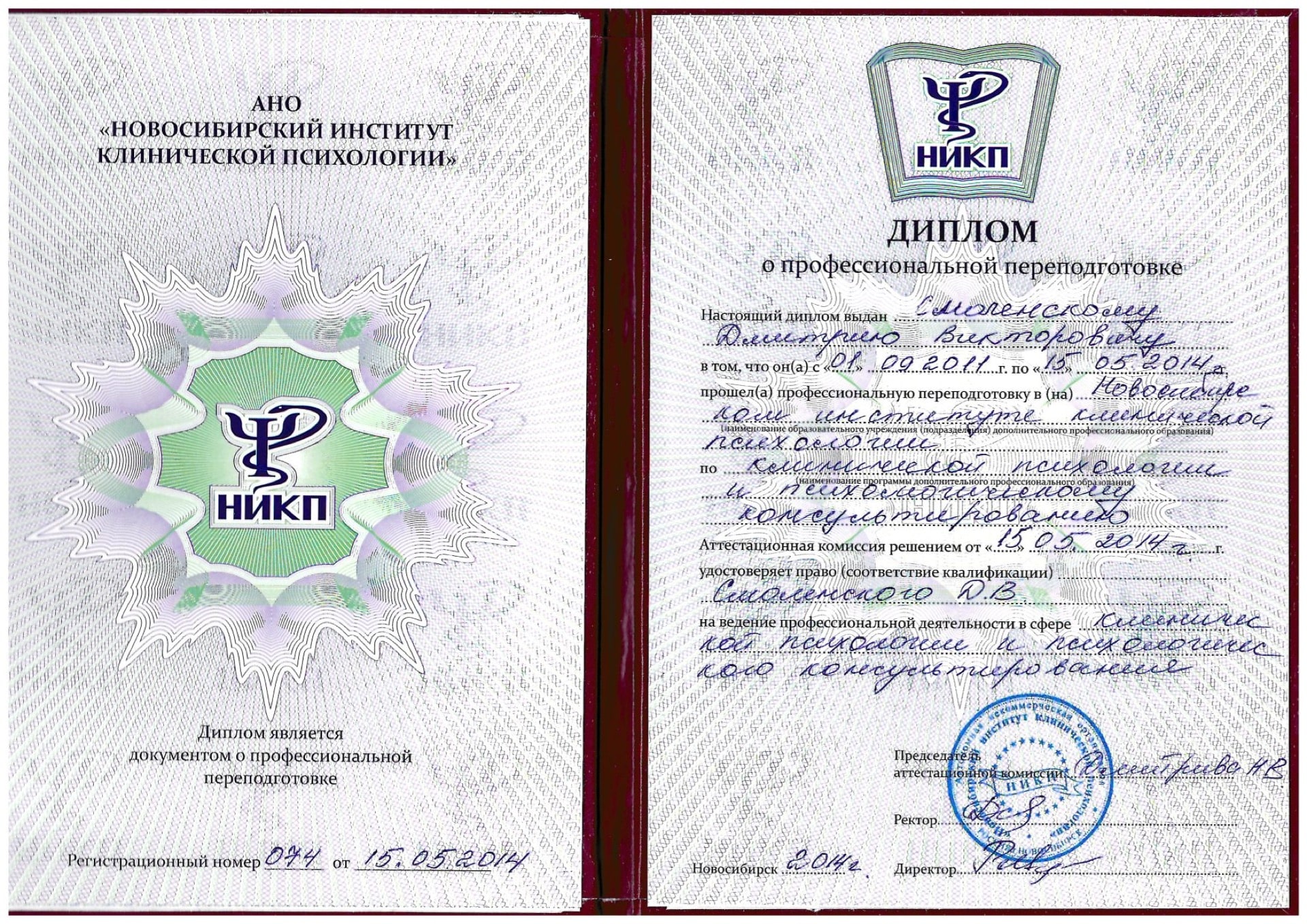 - Новосибирский институт клинической психологии. Профессиональная переподготовка (соответствие квалификации) на ведение профессиональной деятельности в сфере клинической психологии и психологического консультирования. 2011–2014 гг.