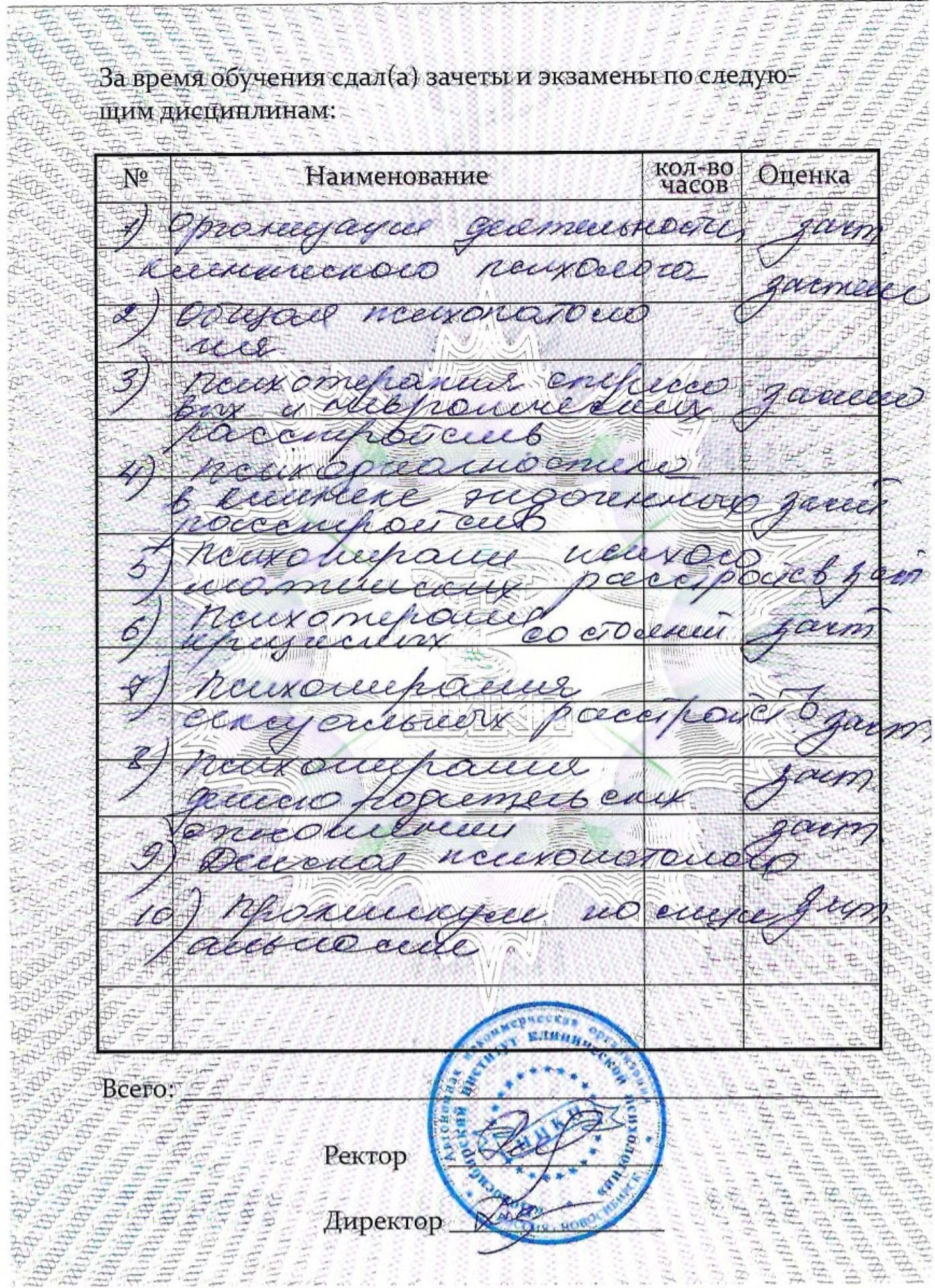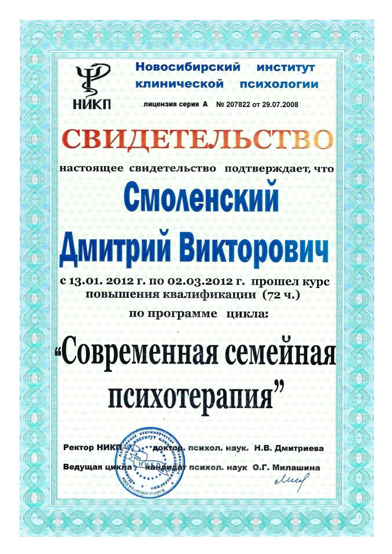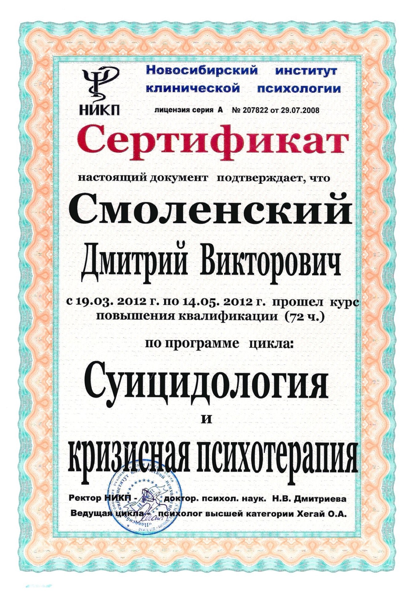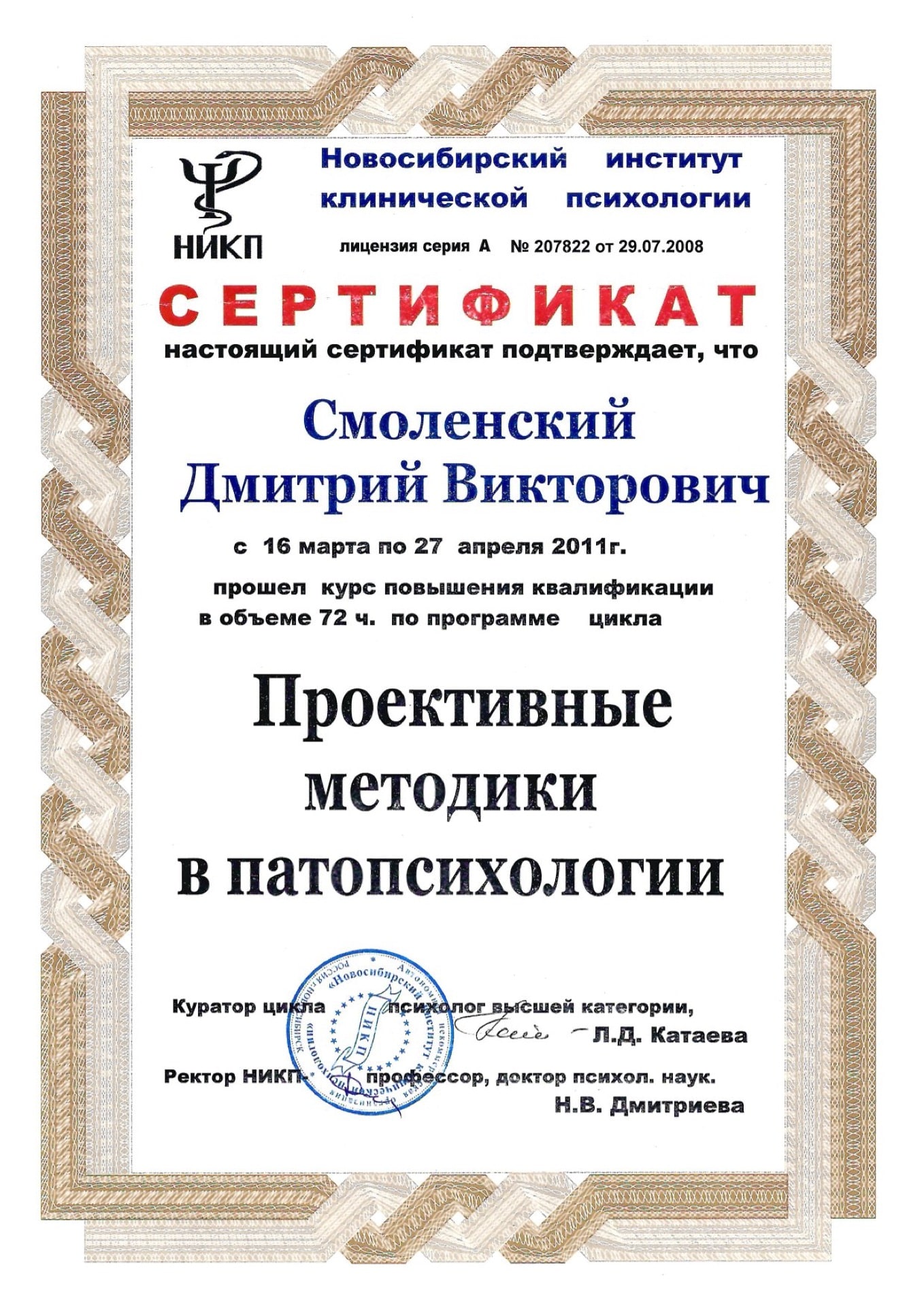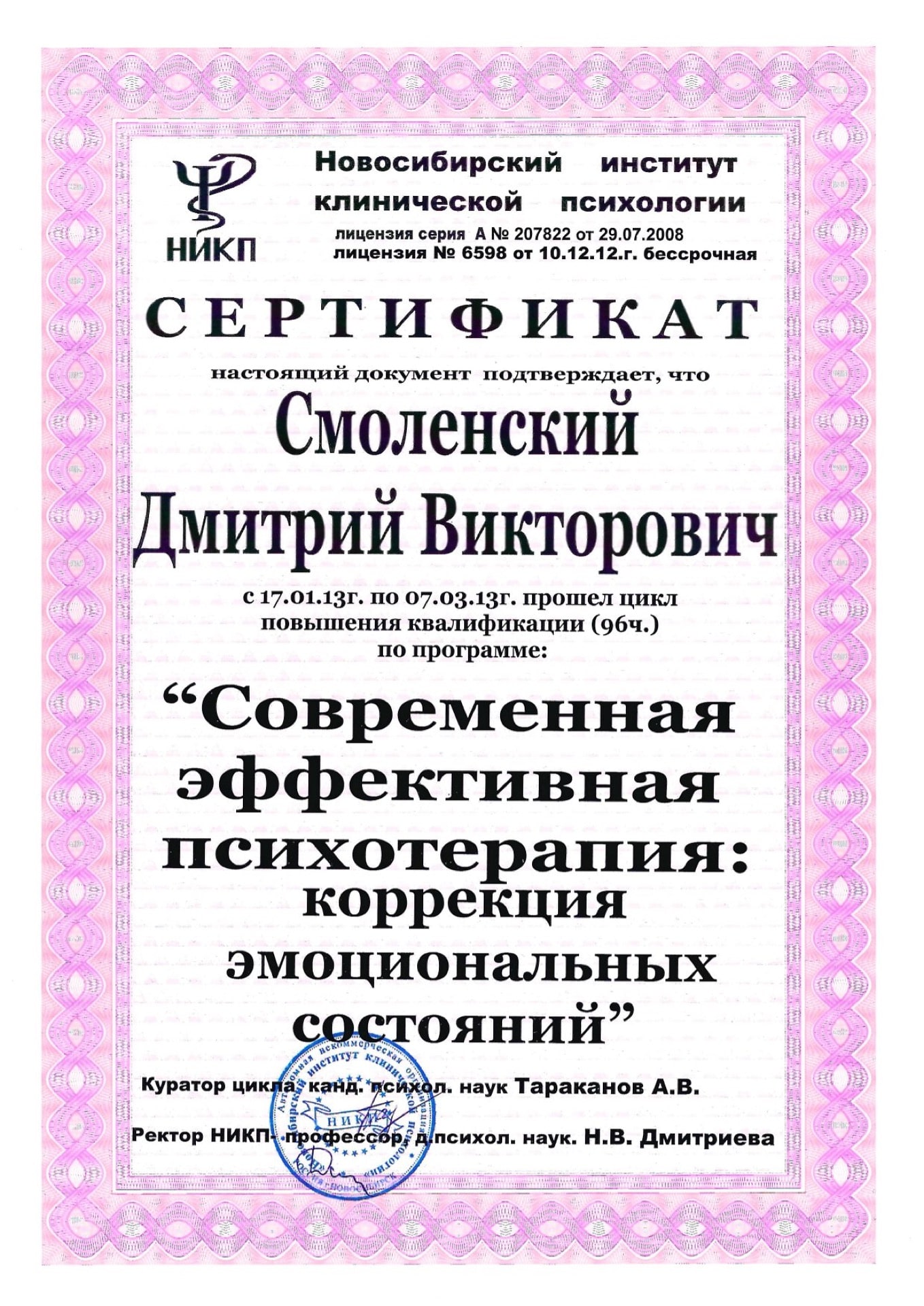 - Новосибирский институт клинической психологии. Профессиональная переподготовка (соответствие квалификации) на ведение профессиональной деятельности в сфере клинической психологии и психологического консультирования. 2011–2014 гг.