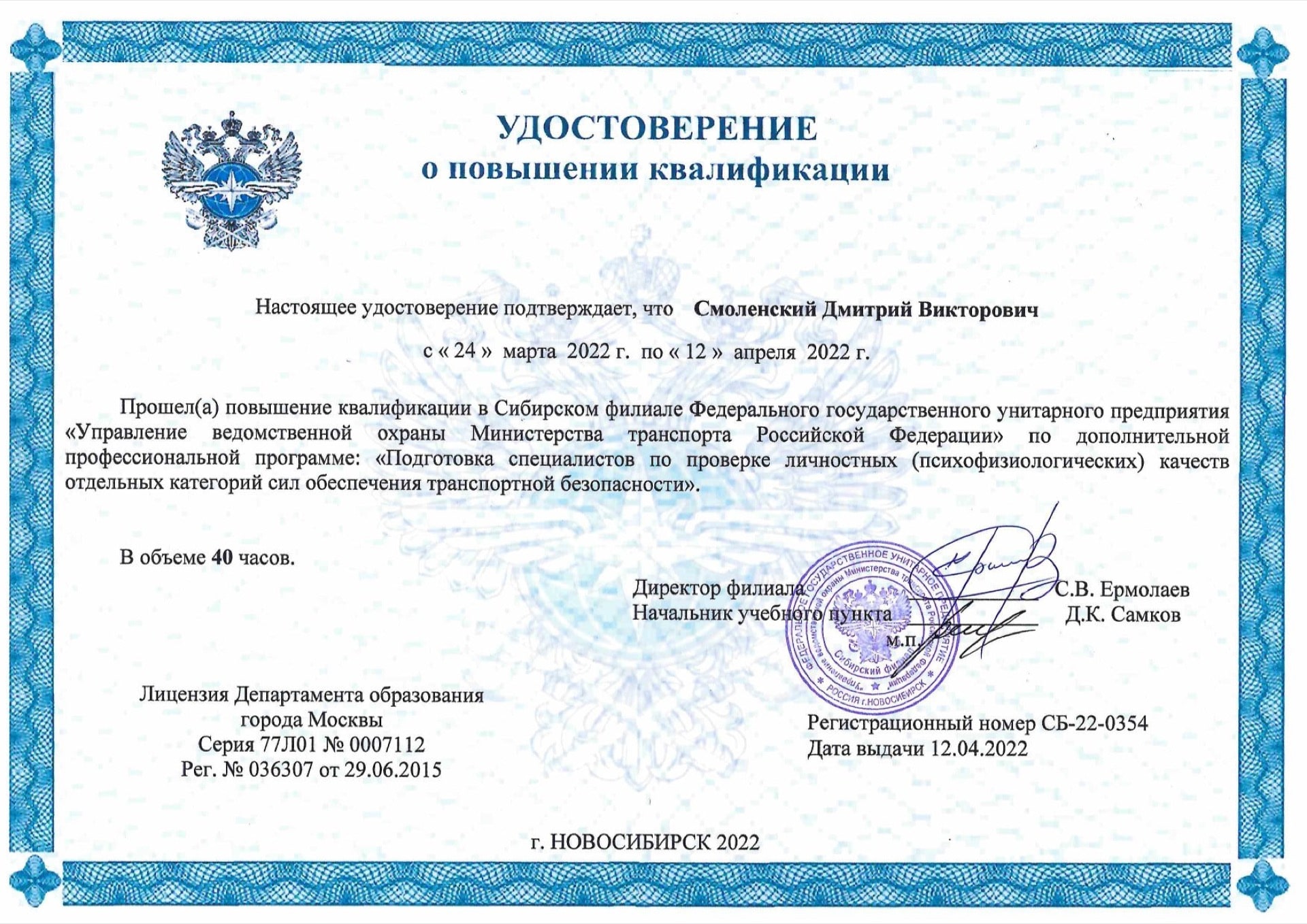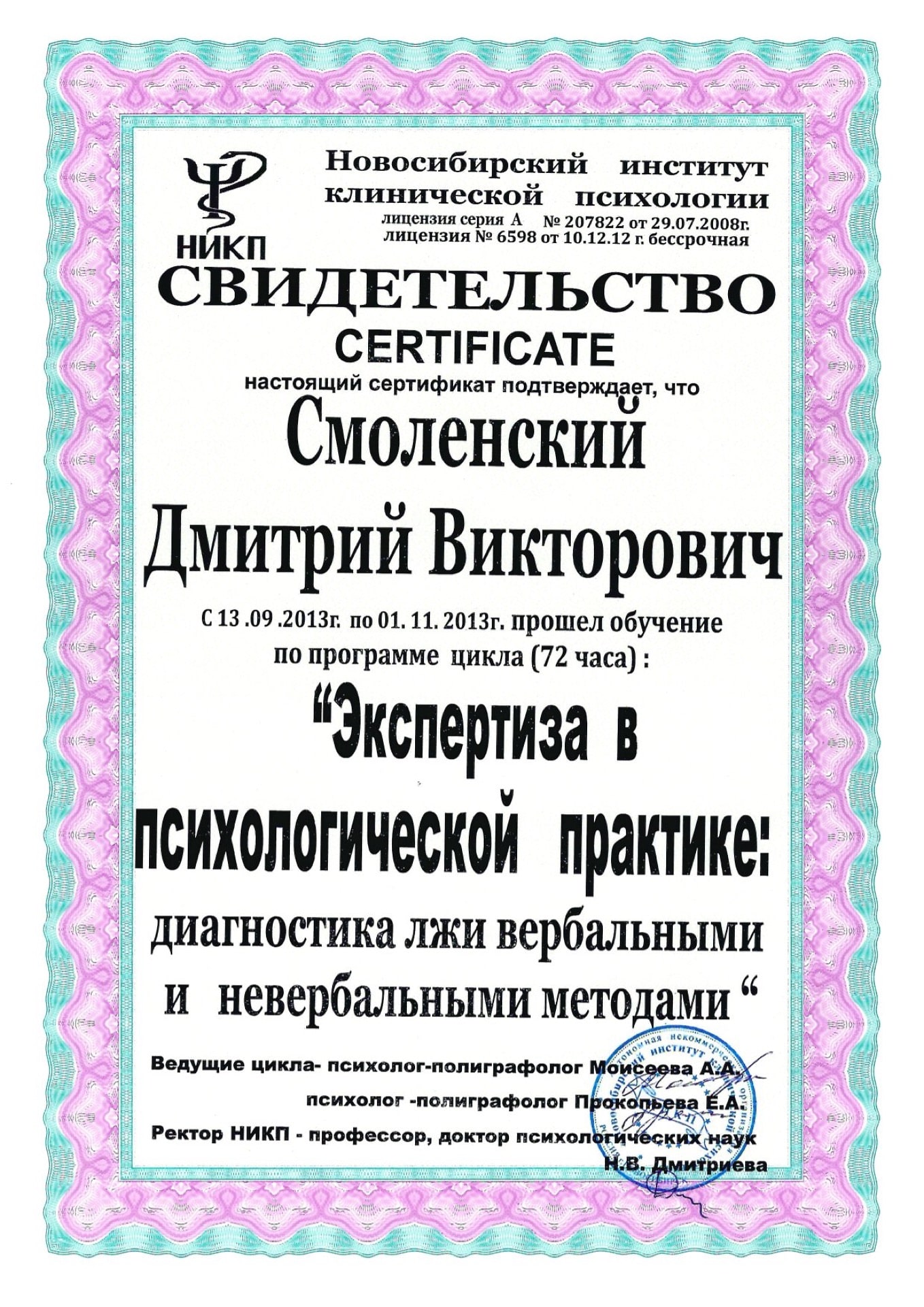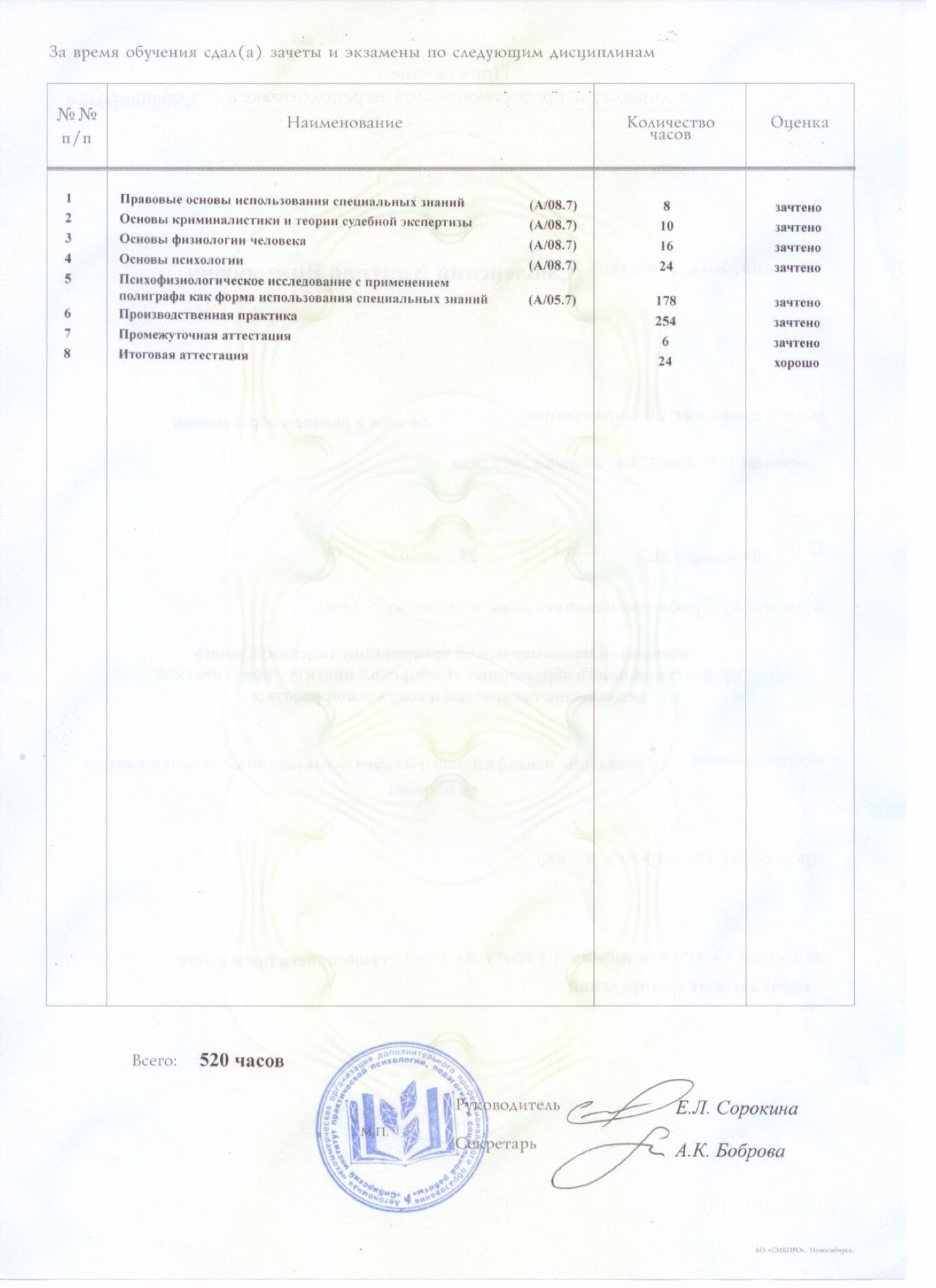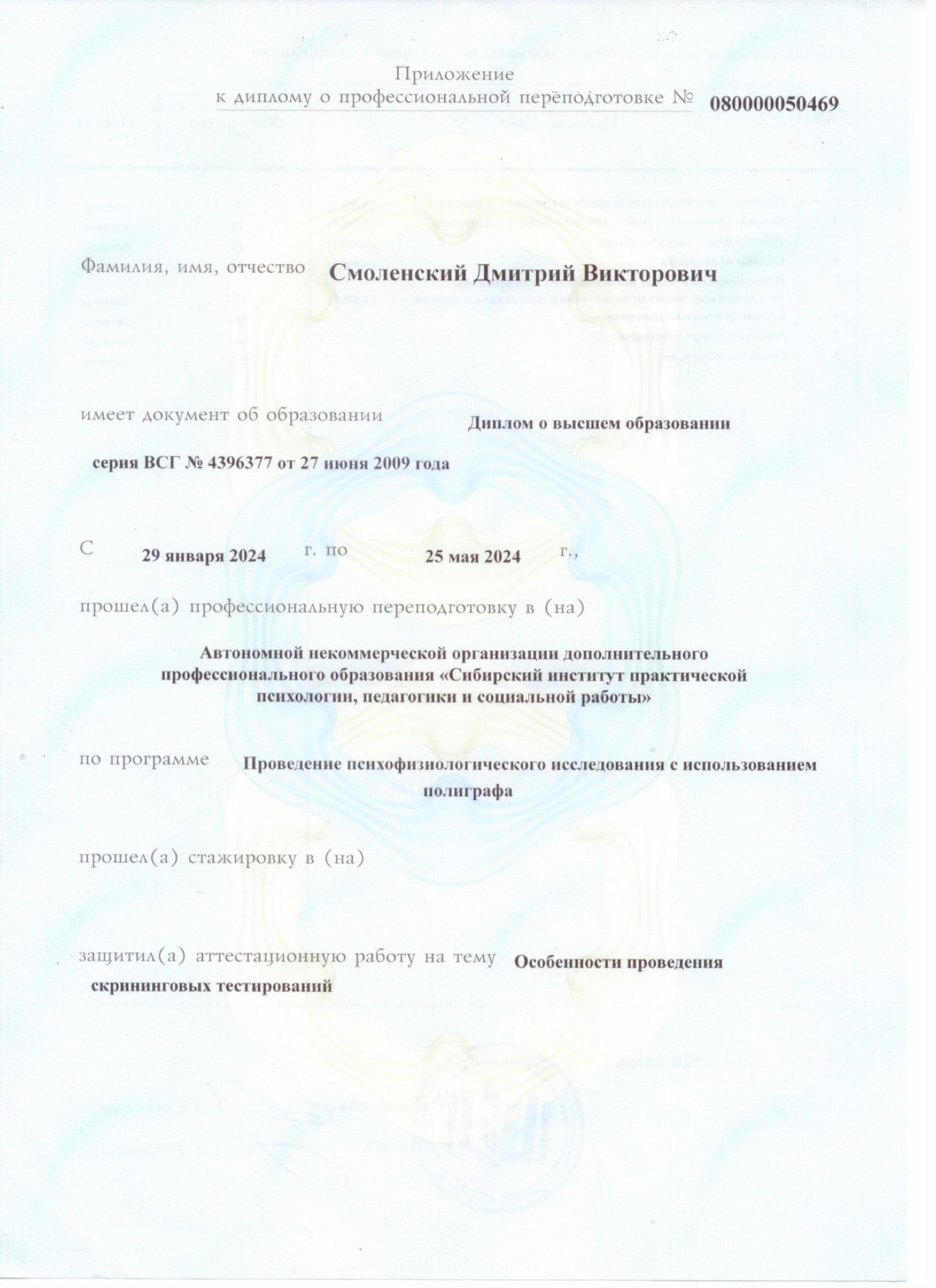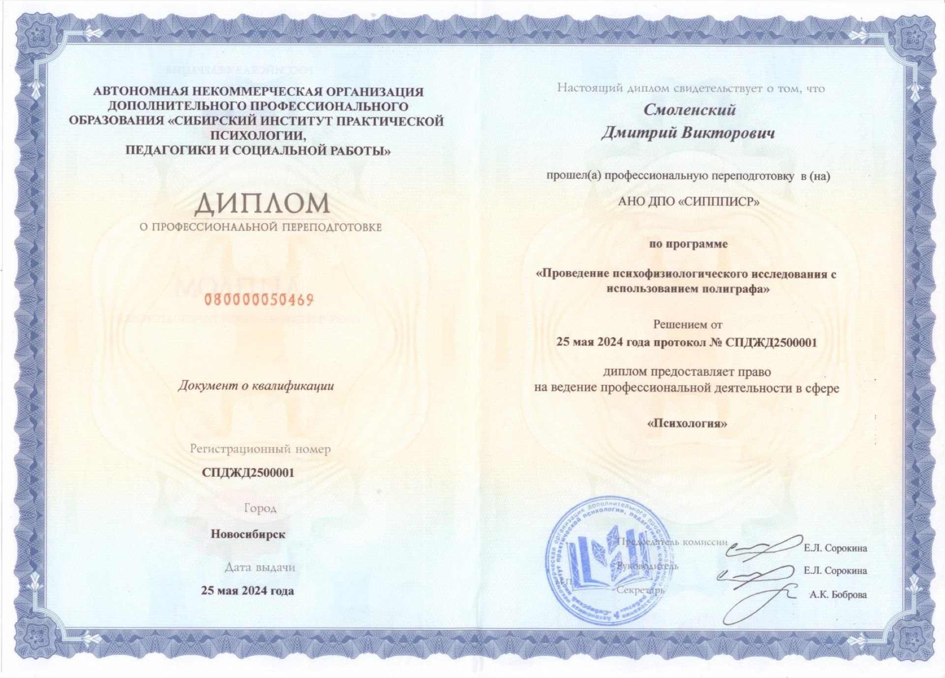 - Сибирский институт практической психологии, педагогики и социальной работы. Профессиональная переподготовка «Проведение психофизиологического исследования с использованием полиграфа». 2024 г.